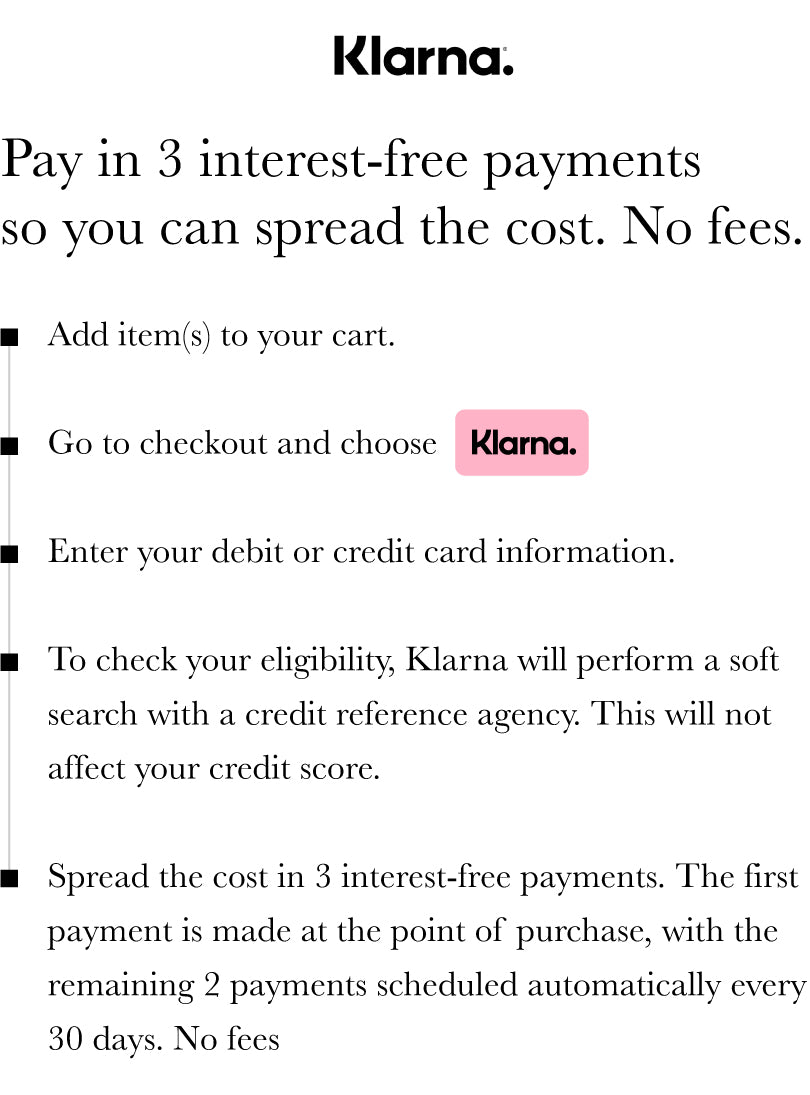 You must be 18+ to use this credit offer. Klarna uses soft searches with credit reference agencies. These do not affect your credit ratings. Missed payments can affect your ability to use Klarna. Pay in 3 instalments complete terms.